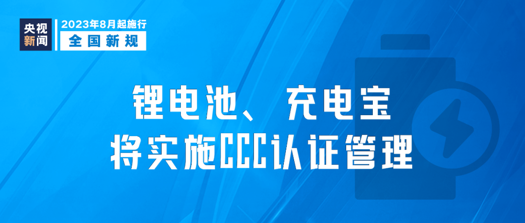 市場(chǎng)監(jiān)管總局發(fā)布公告,自2023年8月1日起,對(duì)鋰離子電池和電池組、移動(dòng)電源實(shí)施CCC認(rèn)證管理;自2024年8月1日起,未獲得CCC認(rèn)證證書和標(biāo)注認(rèn)證標(biāo)志的,不得出廠、銷售、進(jìn)口或者在其他經(jīng)營活動(dòng)中使用。